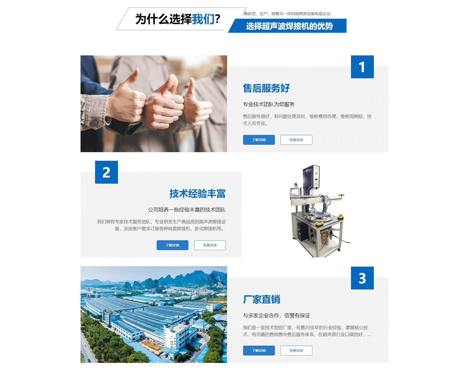 公司是一家集研發、生產、銷售為一體的超音波設備制造企業,主要產品包括多規格型號的超音波塑膠熔接機、熱板式塑料焊接機、多工位轉盤焊接機、各式熱壓機、旋轉式塑膠熔接機、清洗機及配套的工裝夾具等。,同時配合口罩行業、紙制品行業、拉鏈行業、五金壓鑄行業的超聲波發生器、換能器、鋼模的供應。公司為方便服務客戶,更好的開展售前、售中、售后工作,設立了泉州,溫州辦事處。 廈門勁榮機械設備有限公司是一家從事超聲波焊接機、塑料焊接機、超聲波焊接機、超音波熔接機的公司,聯系人:王經理,歡迎咨詢我們。 超音波熔接機,廈門超聲波焊接機,塑料焊接機,超聲波焊接機,熱板焊接機,伺服超聲波焊接機,轉盤塑料焊接機, 廈門超聲波焊接機_超聲波焊接機_熱板焊接機轉盤超聲波焊接機_伺服超聲波焊接機-廈門勁榮機械設備有限公司